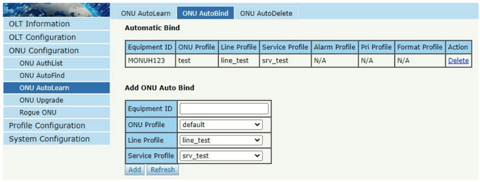 ● Only the ONU which is added after finished this configuration can be bonded with the profiles based on equipment ID. It means that you should configure autobind rules first then connect ONU to OLT PON port If the ONU has already been in the ONU list. you need to delete it after you finished autobind configuration.