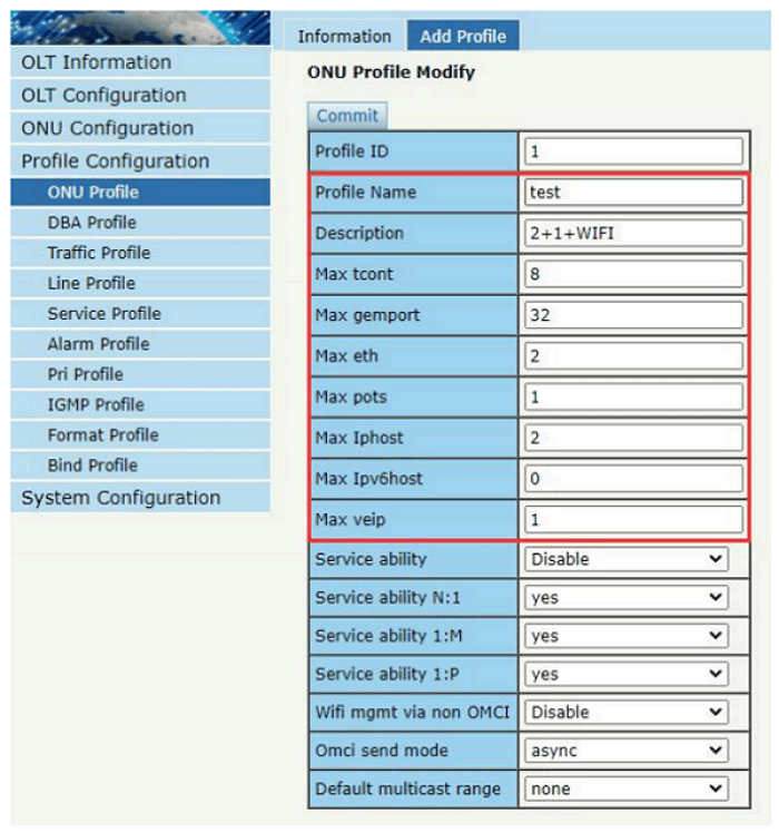 ● Fill in the correct values that the ONU supports. If you don't know how many tcont and gemport the ONU supports, you can use default values. They are enough for all services.