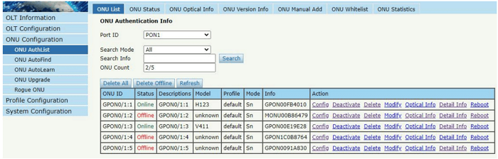 After adding the ONU, you can check the ONU authentication information on the ONU list. It will take few seconds to go online.