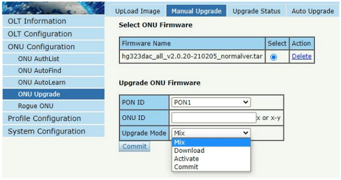 - Select the firmware in the list and PON port input ONU ID select upgrade mode.