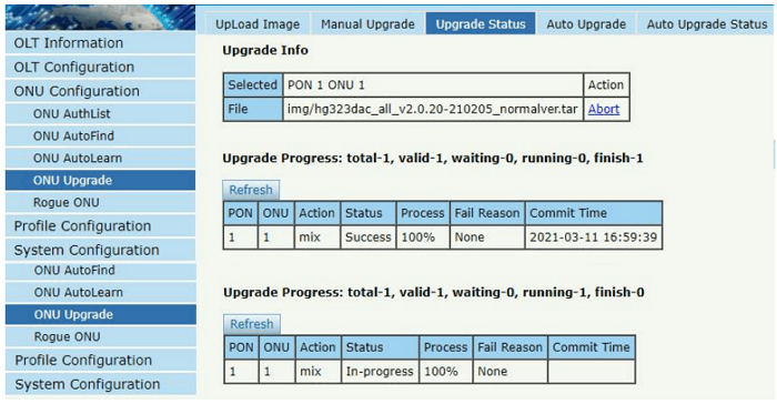 When upgrading, you can query upgrade status. The stats showing success indicates current ONU upgrade procee has finished.