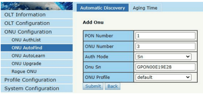 ● If autolean function is disabled you need to add ONU manually. OLT can discover ONU automatically.