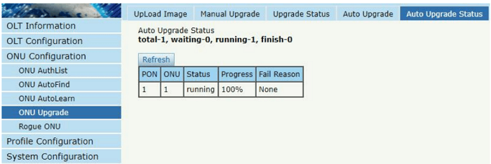 When upgrading, you can query upgrade status. The status showing success or failure indicates the current ONU upgrade process is finished.
