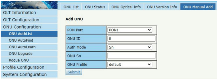 Besides the previous process of adding an ONU. you can add ONU before connecting it to OLT. Choose the PON port and ONU profile to fill in the authentication information of the ONU. then click Submit button.