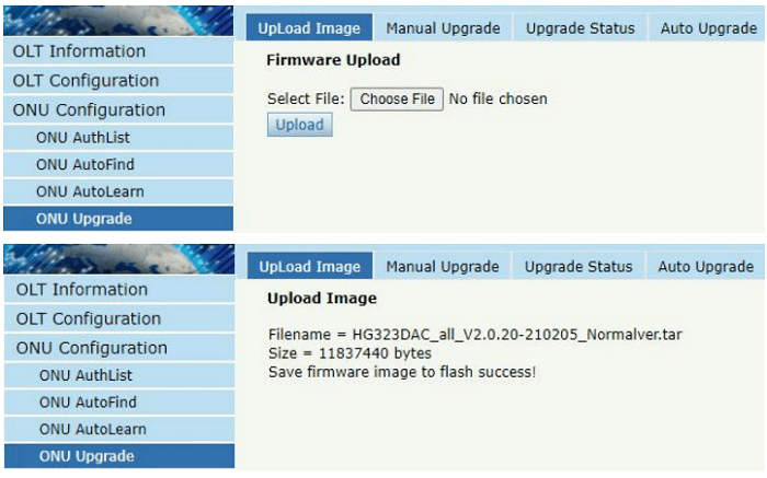 - If the selected firmware version is not the same as that configured in auto upgrade, OLT will upgrade the ONU again and again.