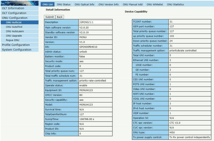 Querying more detailed info on an ONU, please check ONU List=>Detail Info.