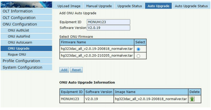 - Fill ONU equipment ID and the new firmware version, select the firmware that need to upgrade, click Add button to submit auto upgrade. If the ONU current version is not the same as that configured in auto upgrade, OLT will upgrade the ONU.