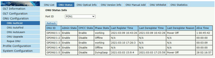 After adding ONU, you can check the ONU detail status on the ONU table. The status contains management status, register status, the time related to registering and deregistering, and also the last deregister.
