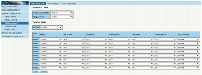 ● Plug and play function is used to bind profiles automatically. Once the ONU registers to the OLT and goes online the profiles configured in the table will be bond to it. If didn't configure any profile OLT will configure ONU with default settings