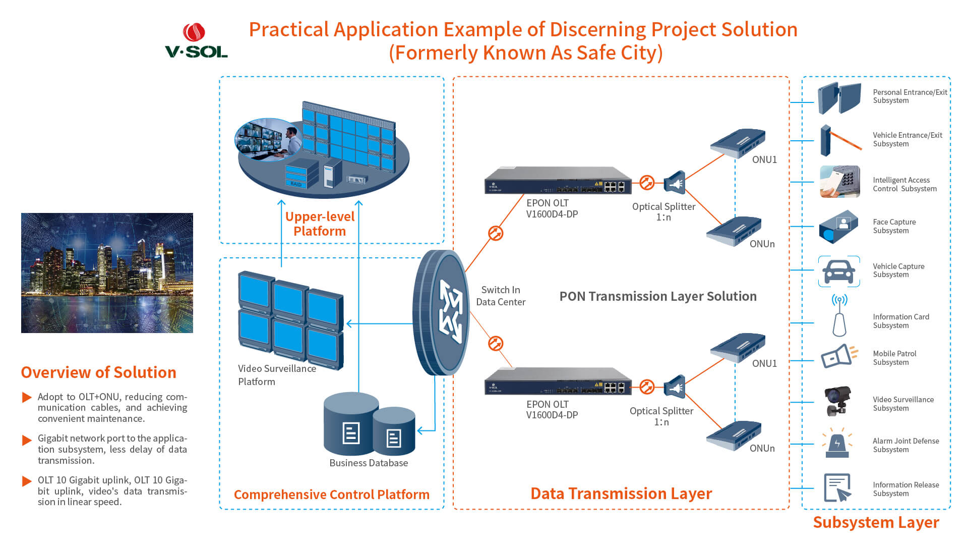 Through V-SOL Tech's PON transmission solution and the tunneling protocol VPN function of fiber optic broadband developed specifically for the discerning project, the original public video subsystem can be connected to the central platform through simple configuration to achieve the collection of grassroots data.